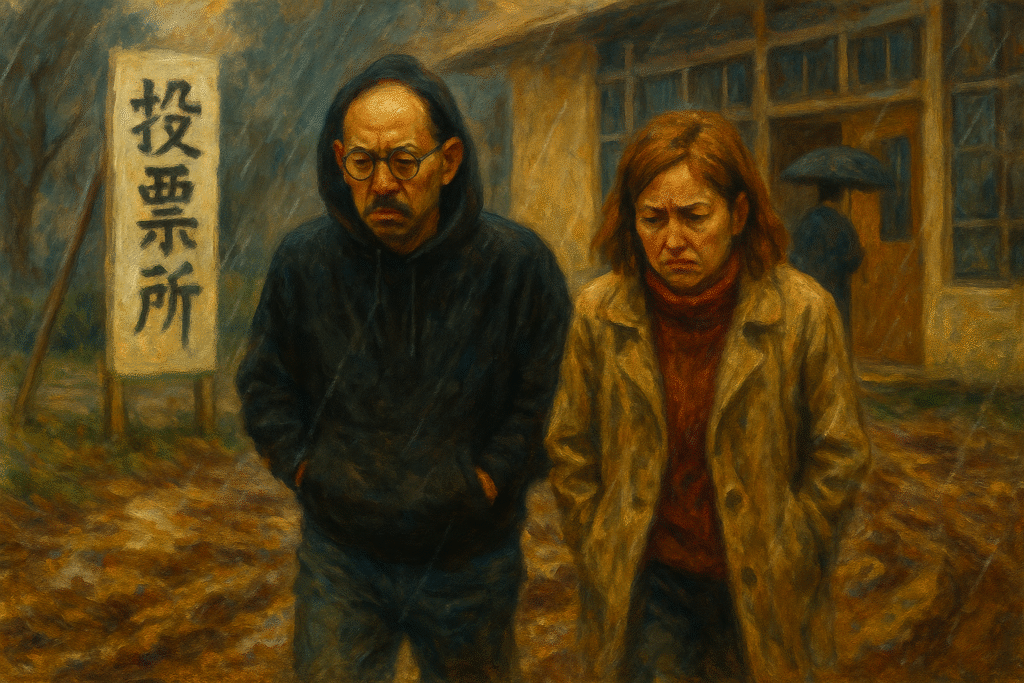 🐼宮城県知事選挙の投票での話。投票所の小学校の体育館前の通路が、雨で「泥路」になっていて、うわーってなって頑張って投票したのに・・・